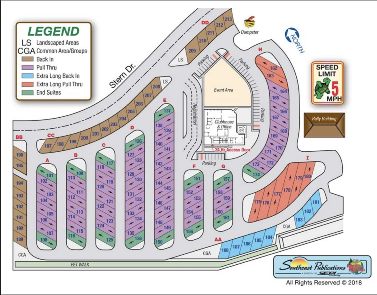 Spacious pads with plenty of room for slide-outs, and your tow vehicle